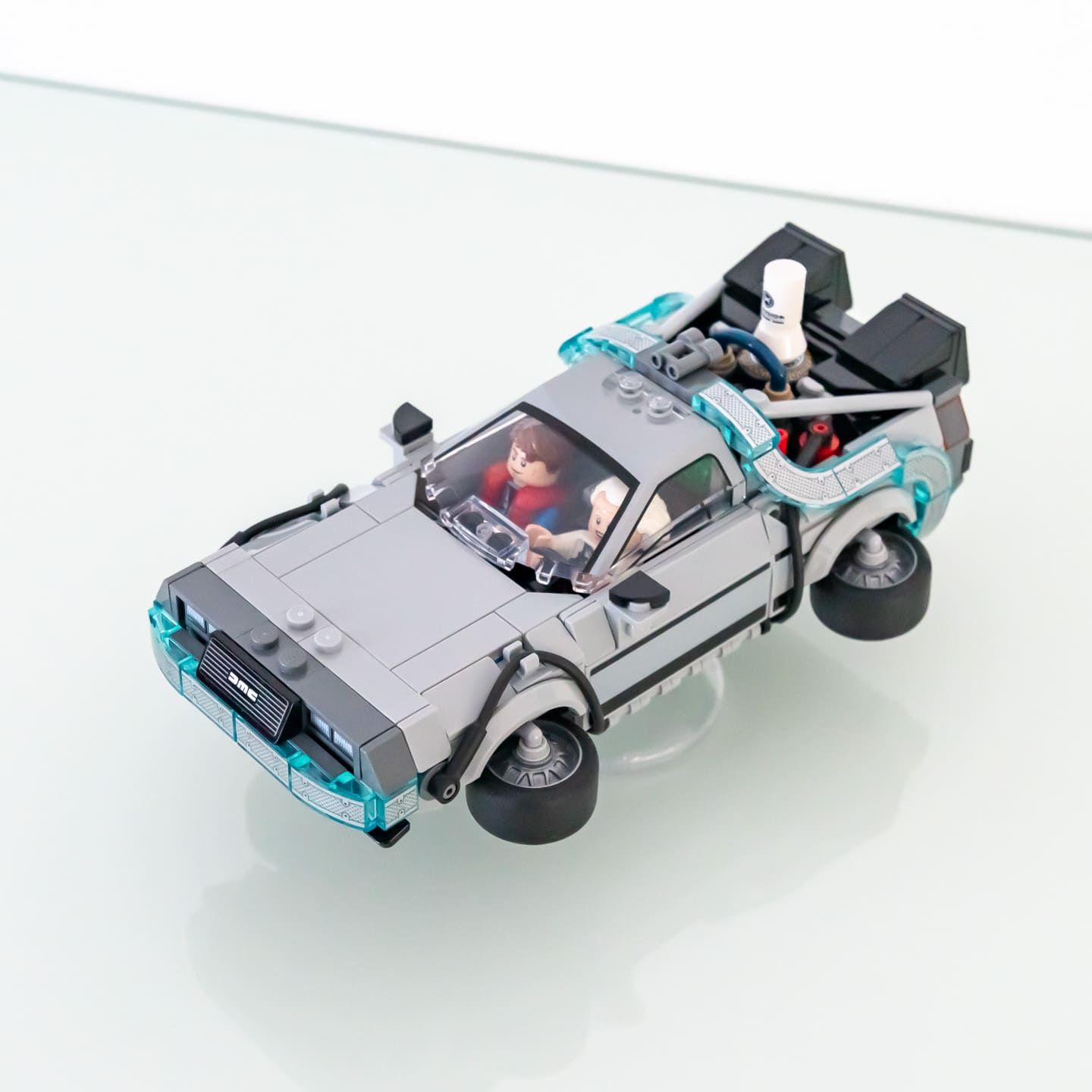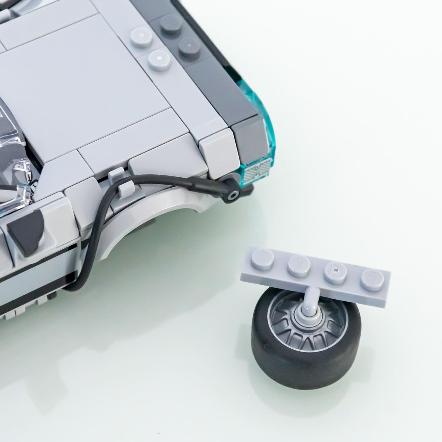Il est possible d’assembler au choix la version du premier ou du deuxième film de la trilogie. Pas de fonctionnalité cachée pour les roues comme avec le gros set LEGO Icons 10300 Back to the Future Time Machine (logique vu l’échelle ici), mais la transformation reste très facile et se fait en moins de 30 secondes montre en main : on retire la canne à pêche pour installer le réacteur Mr Fusion, on change la plaque d’immatriculation, et on installe les roues sur des Plates, Modified 1 x 4 with Bar Arm Down qu’on vient fixer directement dans les passages de roue, c’est très simple et le rendu est très propre.
