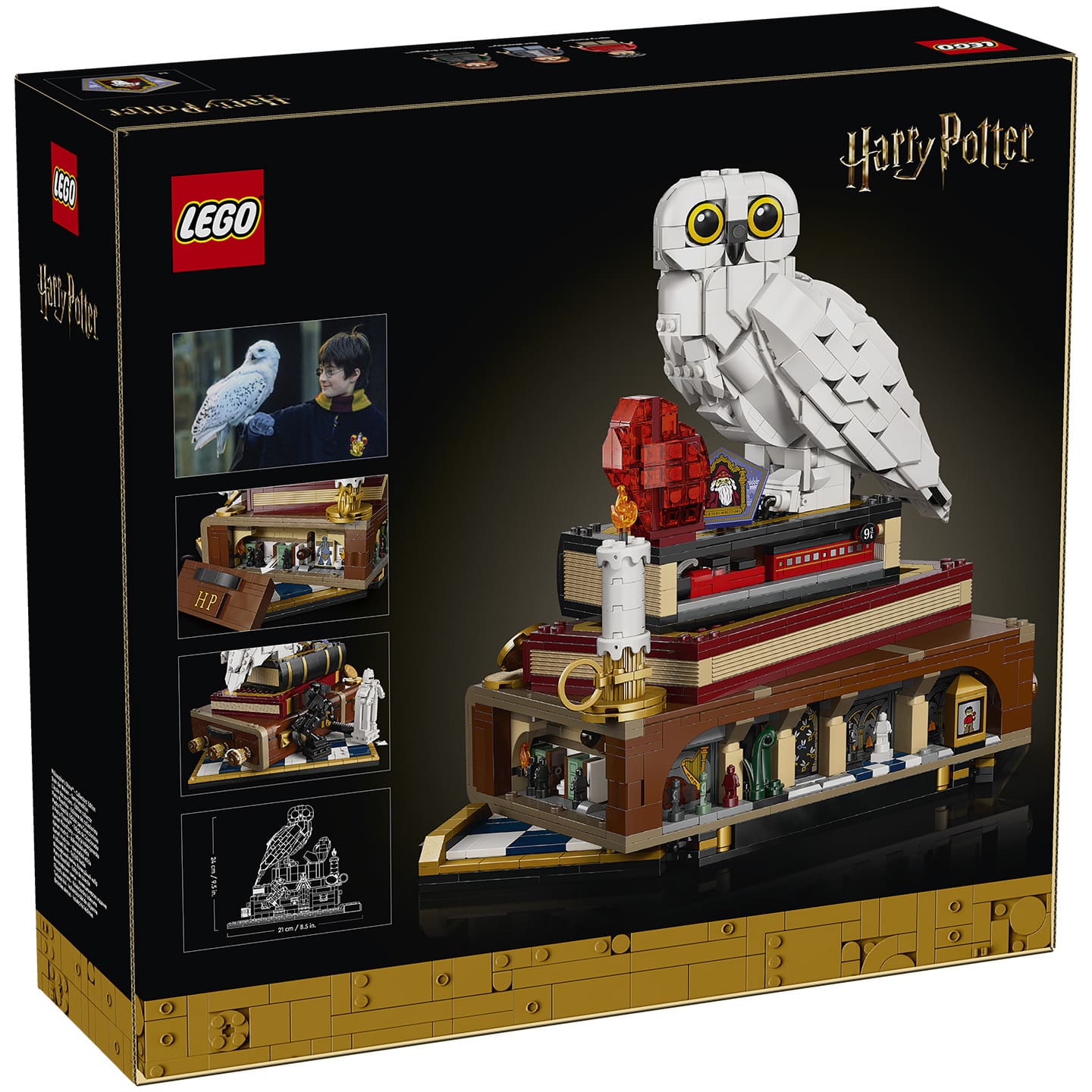La chouette Hedwige posée sur des livres avec de nombreuses références au premier film Harry Potter à l’École des Sorciers (la Pierre philosophale, une carte de Chocogrenouille, un micro Poudlard Express, la partie d’échecs, etc). Une version plus raisonnable que le gros set collector LEGO Harry Potter 76391 Hogwarts Icons Collector’s Edition (3010 pièces, 299,99€) de 2021.