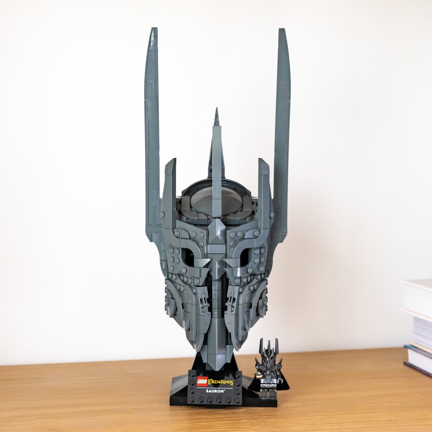 LEGO décline avec ce casque de Sauron le concept déjà vu à de multiples reprises dans les gammes Star Wars, Marvel ou encore DC Comics. Avec un support identique à ceux des autres références, et une petite plaque tampographiée avec le nom du personnage.