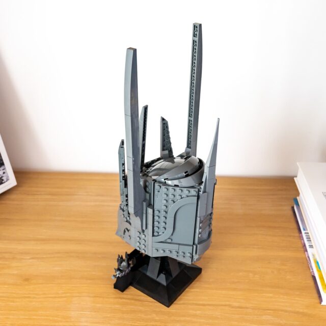 Le grand casque de Sauron mesure 33 cm de haut avec son support. Il est plutôt bien reconnaissable, avec sa forme allongée et les différentes pointes de sa « couronne », même si certaines manquent de pointu, mais c’est la forme des pièces LEGO qui veut ça.
